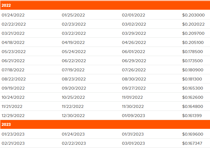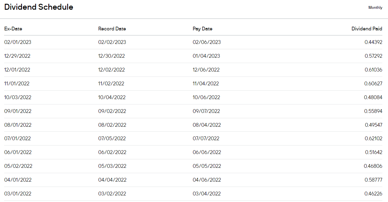 최근 1년간 월 배당 평균은 $0.53, 연배당은 $6.42이다.